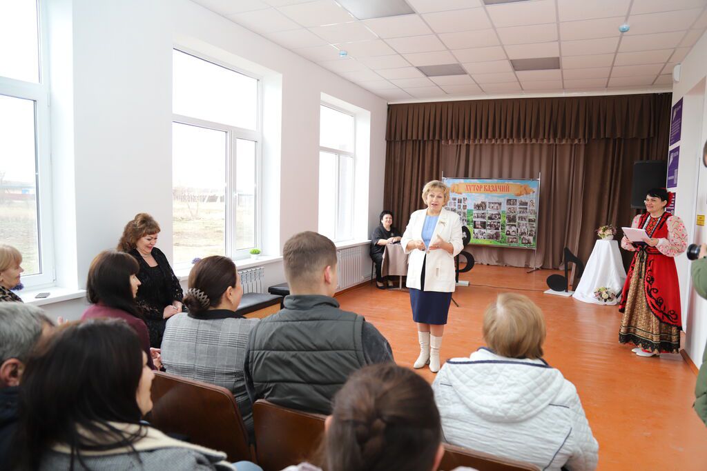 - Уважаемые земляки, дорогие друзья! Сельский Дом культуры – это душа и сердце хутора. Учреждение культуры в глубинке - это целый мир, мир творчества и развлечений. Здесь каждый может выбрать себе занятие по душе: петь, танцевать, заниматься декоративно-прикладным творчеством, народными промыслами. И очень приятно, что в такой красоте теперь будут проходить занятия, праздники, вечера отдыха. От всей души поздравляю вас с этим замечательным событием - открытием Дома культуры после капитального ремонта. Благодаря государственным программам мы имеем возможность ремонтировать наши учреждения культуры даже в маленьких населенных пунктах. После ремонта мы получили обновлённое и снаружи, и внутри здание, в котором комфортно будет и посетителям, и коллективу сотрудников. Уверена, что открытие обновлённого Дома культуры повлияет на культурную жизнь хуторов Казачий и Ея, расширит возможности для досуга местных жителей, а значит, улучшит качество жизни людей, - с приветственным словом выступила начальник отдела культуры МО Крыловский район Дарья Александровна Кливитенко.